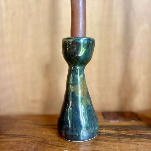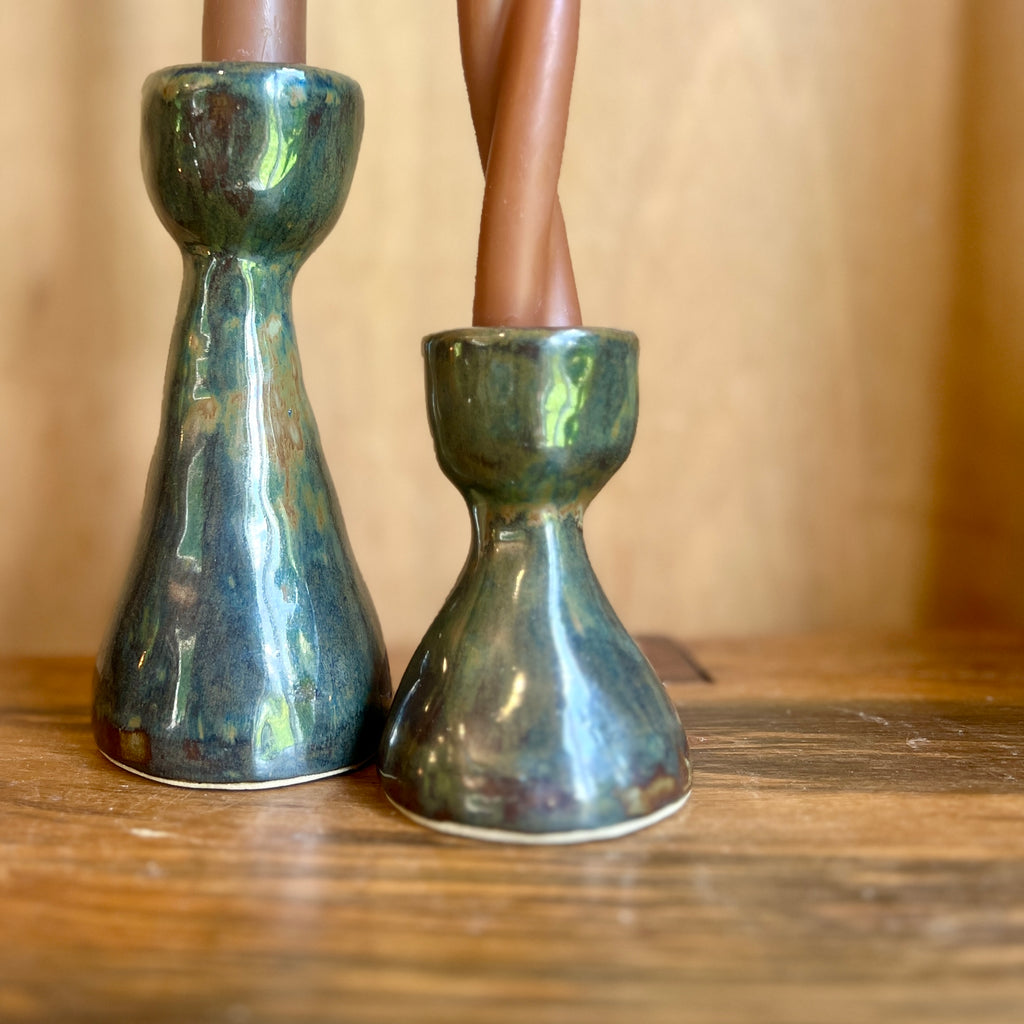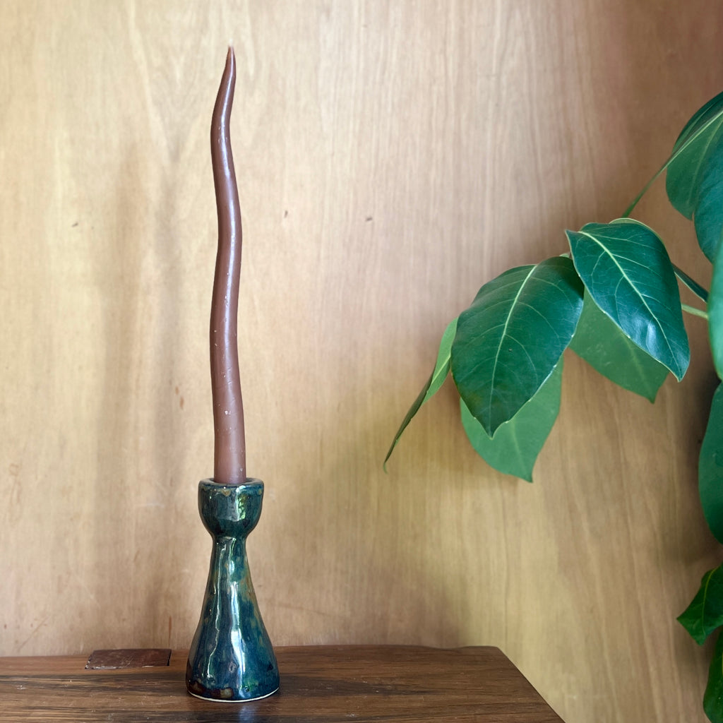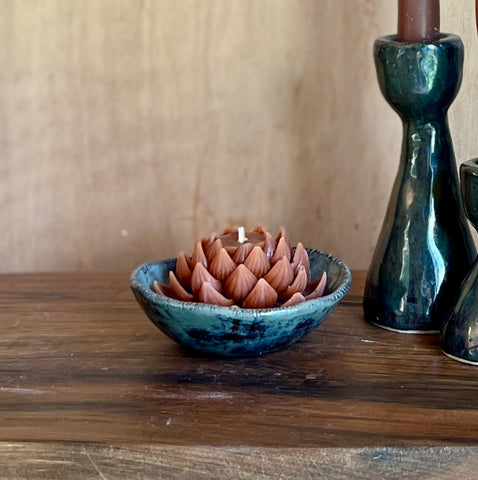 The 3 handmade ceramic candle holders have a dark blue glaze with brown streaks running through which pairs beautifully with the dark amber candles.